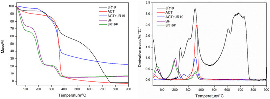 Figure 6 shows that JR19 presents four stages of mass loss (30–140.71 °C, Δm = 5.97%; 140.71–253.74 °C, Δm = 3.81%; 253.74–462.4 °C, Δm = 33.51%, and 462.4–748.3 °C, Δm = 56.30%) with a residual mass of 0.41%. ACT presents two stages of mass loss (30.66–151.66 °C, Δm = 9.216%; 256.59–441.86 °C, Δm = 84.4%), the first one is due to the loss of volatile components adsorbed to the polymer or due to waste water. The second one (loss of 84.4% of ACT) is reported to be due to the thermal decomposition of ACT chains, to the loss of acetyl groups as well as due to the polymeric chain fission and carbonization, leaving a residual mass of 6.384% [53,54]. For the physical mixture ACT + JR19, the presence of four stages of weight loss is observed (39.17–110.07 °C, Δm = 2.097%; 110.07–228.23 °C, Δm = 3.545%; 228.23–295.34 °C, Δm = 11.76% and 295.34–424.85 °C, Δm = 47.08%), with a predominance of loss of mass, which is similar to the aforementioned events of ACT.