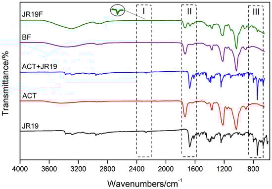 FTIR spectrum of JR19, ACT, JR19 + ACT (physical mixture), BF and JR19F.