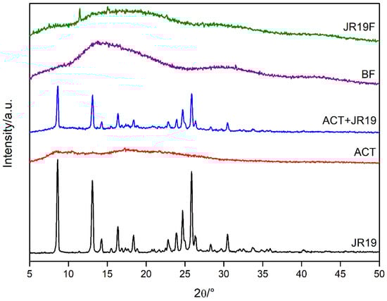 The XRD analyses were performed with the purpose of evaluating the degree of crystallinity and amorphicity of the samples. When X-rays interact with a crystalline material, a diffraction pattern is generated and the more three-dimensional crystalline structures are present in the materials, the more intense and narrower are the peaks in the diffractogram. On the other hand, the amorphous fraction generates broad peaks and smaller “halos” depending on the present and extent of this fraction [61]. X-ray diffractograms of JR19, ACT, ACT + JR19 (physical mixture), BF and JR19F are shown in Figure 8.