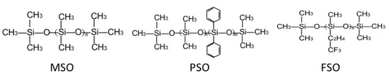 The chemical structures of three types of silicone oils, MSO, PSO and FSO, are shown in Figure 1. The different chemical structures determine their difference with PDMS, and the different compatibilities of each silicone oil and PDMS mixture.