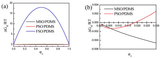 The Flory–Huggins lattice model is most commonly used to describe the mixing phenomenon of polymer solutions. Based on this model [35,36], therefore, the thermodynamics of the silicone oil/PDMS blend solutions can be analyzed as follows.
