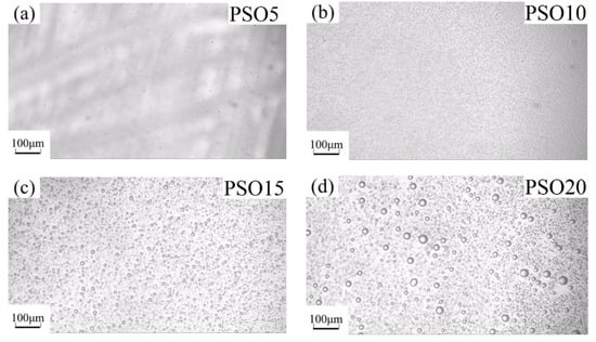OM images of PSO/PDMS mixtures: (a) PSO5, (b) PSO10, (c) PSO15, (d) PSO20.