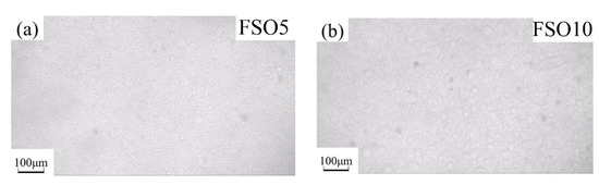 The silicone oil droplets changed when increasing silicone oil’s concentration in PDMS, which is shown, respectively, for PSO/PDMS and FSO/PDMS mixtures in Figure 4 and Figure 5. The immiscible silicone oil droplets can be seen clearly in the blend solution under the microscope. Furthermore, the size of the droplets became larger after increasing the concentration of silicone oil. The size of FSO droplets was larger than that of PSO droplets, due to the weaker compatibility of FSO with PDMS.