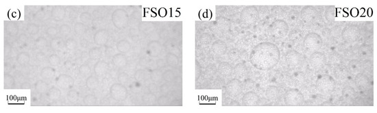 OM images of FSO/PDMS mixtures: (a) FSO5, (b) FSO10, (c) FSO15, (d) FSO20.