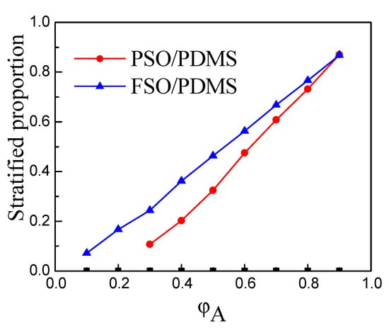 Further quantitative analysis shows that the proportion of layered silicone oil in the total volume of the mixture increases linearly with the increase in the silicone oil concentration, as shown in Figure 6, and the limit proportion of the two types of PSO and FSO tends to be the same.