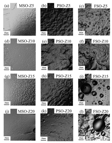 The compatibility of silicone oil and polydimethylsiloxane and the degree of phase separation in the mixed solution will inevitably affect the microstructure of the cured coating. As it is shown in Figure 7a,d,g,j, the MSO droplets produced by phase separation cannot be found in the fracture of samples MSO-Z5, MSO-Z10, MSO-Z15 and MSO-Z20. The solubility of MSO and PDMS is excellent, and they can dissolve each other in any proportion. In the liquid state, the phase separation of MSO dissolved in PDMS still did not occur during the film-forming process.
