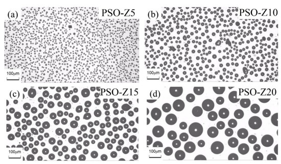 OM morphology of leached PSO droplets on PSO/PDMS coatings: (a) PSO-Z5, (b) PSO-Z10, (c) PSO-Z15, (d) PSO-Z20.