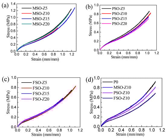 Tensile stress–strain curves of silicone coatings: (a) MSO/PDMS coating, (b) PSO/PDMS coating, (c) FSO/PDMS coating, (d) different silicone oil/PDMS coatings.