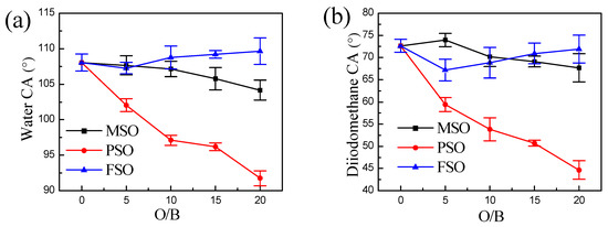 CA changes with O/B in the coatings of different silicone oils, (a) water contact angle and (b) diiodomethane contact angle.
