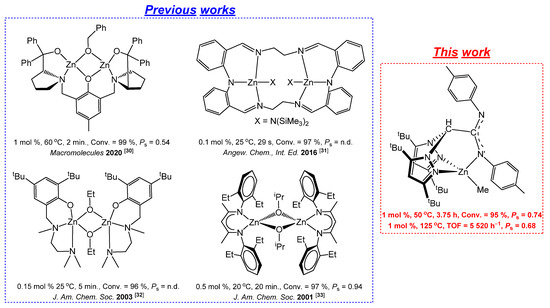 Particularly, our research group has successfully reported over the last few years a series of well-defined mono- and multinuclear organo-zinc [41,42,43,44,45,46] scorpionate complexes as efficient one-component initiators for the living ROP of cyclic esters [47], and significant levels of isotacticity (Pi = 0.77 [44,45]–0.88 [41]) have been successfully attained.