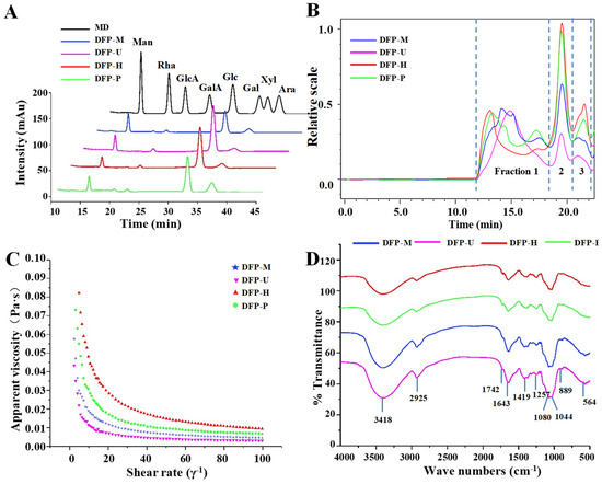 3.1.2. Constituent Monosaccharides, Molecular Weights, and Apparent Viscosities of DFPs
