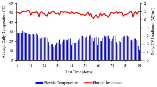 The specialist site chosen in Florida for these studies was equipped with weatherometers capable of capturing and recording the climatic conditions over the time of the exposure. Figure 2 presents the average daily temperature and UV irradiance experienced by the films at this site during the period of June–August, whereas Figure 3 presents the average daily temperature and UV irradiance experienced by the films at this site during the period of September–December. Average daily rainfall and average humidity were also recorded (see Figures S2 and S3).