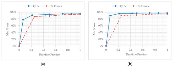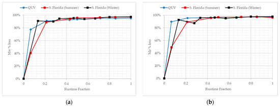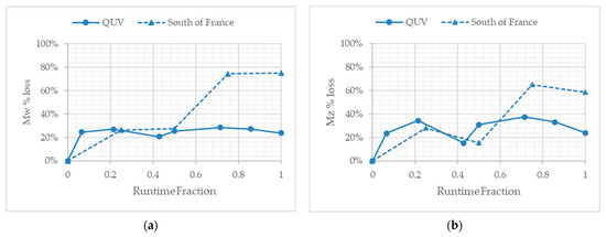 The molecular weight analysis was obtained by HT-GPC analysis using TCB as solvent. All the samples completely dissolved in the TCB, suggesting that no gel or insoluble formations were produced as a result of the QUV or outdoor weathering. As previously reported [22], the key changes in molecular weight are more clearly observed when the loss and percentage (%) loss of weight-average molecular weight (Mw) and higher weight-average molecular weight (Mz) are compared and plotted (Table 2 and Figure 4). Furthermore, the use of the runtime fraction [16] allowed for the comparison of temperate laboratory accelerated and outdoor exposure studies to be compared and contrasted (Figure 4 and Figure 5).