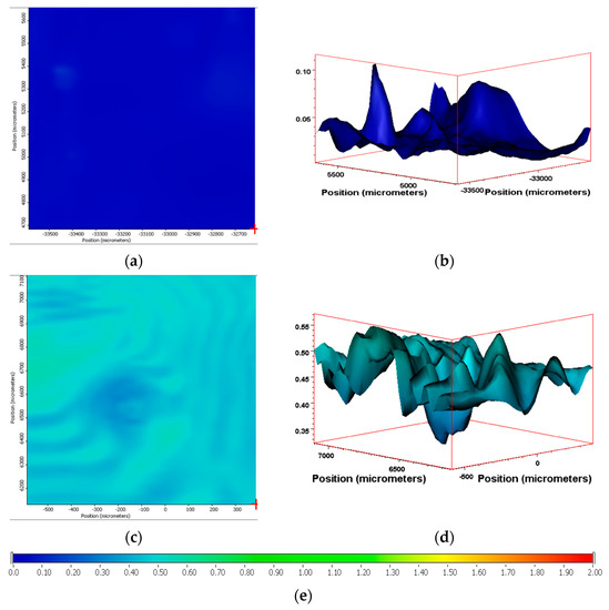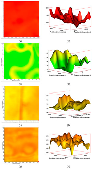 Sample PE-02 gives the highest calculated SAUB CI across the measured area of 1 mm2. The range of CI calculated is small, with a variance of 0.15, producing an effectively even ‘red’ surface image mapping when suing the ‘hotspot’ imagery (Figure 9a). When represented as a 3-D CI tomograph, the minor differences are evident in the CI ranging from 1.85 to 2.0 in the lowest troughs to the highest peaks, respectively (Figure 9b). Sample PE-04 has a larger divergence in the CI over the 1 mm2 surface area measured. The range is from 1.1 to 1.6, producing a green and yellow surface map with the equivalent ‘valley and peak’ in the 3-D tomographs (Figure 9c,d). The CI range of PE-04 (1.1–1.6) is approximately 3- to 4-fold higher as the range of CI measured for PE-03 (0.25–0.55) for an equivalent 1 mm2 area measured. PE-05 and PE-06 gives similar surface maps and 3-D CI tomographs post-exposure in Florida, despite being exposed at different times of the year. The range of CIs calculated is from 1.75 to 1.55 and 1.5 to 1.7 for PE-05 and PE-06, respectively (Figure 9e–h).