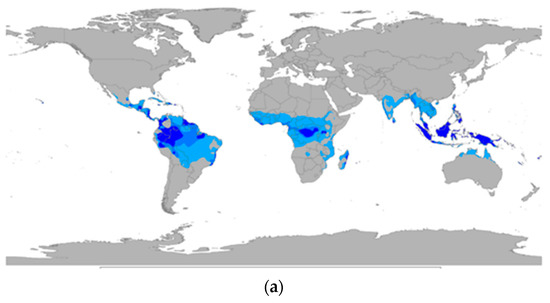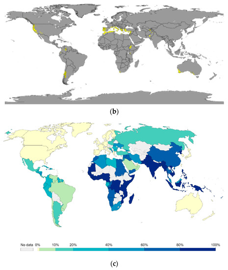 (a) Global image showing the Tropical Climate Zone, based upon the Koppen climate classification. (b) Global image showing the Mediterranean Climate Zone, based upon the Koppen climate classification. (c) Global image showing of known geographical areas of high % share of plastic pollution in 2010, based upon Jambeck et al. (2015).