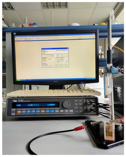 Electropolymerization was carried out in glass cells of a volume of 10 cm3 without separation of the cathode and anode space and without degassing. The composites were formed at room temperature. The cathode potential was (−1.16 ÷ −1.2) V. The electrolysis time was 1–5 min. The equipment for the electrochemical syntheses is shown in Figure 1.