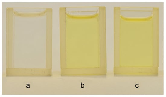 The initial solutions of monomers for electropolymerization (Table 1, electrolytes 1 and 2) are colorless and transparent (Figure 2a). After the introduction of HAuCl4, they acquire the yellow color typical for solutions of tetrachloroauric acid (Figure 2b). It was found that this color did not change, at least for 60 min after the preparation of the solution (Figure 2c), despite the fact that the electrolyte contained such a strong reducing agent as formaldehyde.