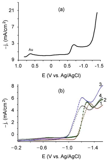 Polarization curves recorded in: (a)—5 mmol/L HAuCl4/0.1 mol/L LiClO4, (b)—electrolyte 1 (1), electrolyte 2 (2), electrolyte 3 (3), electrolyte 4 (4). The potential sweep rate is 10 mV/s.