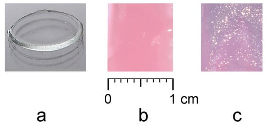 The polymer films prepared by electropolymerization from the base electrolytes 1 and 2 represent an elastic, colorless, and transparent material in the swollen state in water (Figure 5a). On the other hand, the color of the films electrosynthesized in the presence of HAuCl4 (electrolytes 3 and 4) acquires a pink-lilac color (Figure 5b,c).