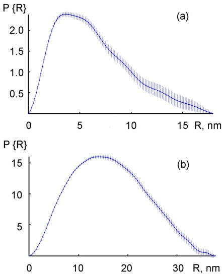 As can be seen from Figure 7, the AuNPs electroreduced from the base electrolytes with the addition of HAuCl4 have a wide range of radii distribution. The radius of the particles depends on the composition of the electrolyte and the concentration of the components. Here, in the composite formed from electrolyte 3, the maximum number of particles has a radius of 3.5–5.0 nm (Figure 7a). Here, the average radius of the particles increases along with HAuCl4 concentration growing (Table 2).