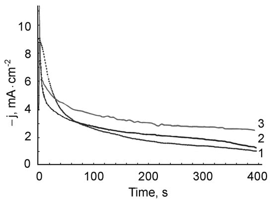 It was found that the inclusion of gold nanoparticles into the polymer matrix affected the electrical conductivity of the coating formed at the cathode. As can be seen from Figure 10, for all the electrolytes during the electropolymerization, as the polymer layer is formed, the current density decreases due to the overlap of the cathode with a layer of a weakly conducting phase. Here, the lowest residual current (ires) is observed for the PMAA coatings formed from the base electrolytes 1 and 2 (Figure 10, curves 1, 2). On the other hand, the inclusion of AuNPs metal particles in the polymer leads to an increase in ires, i.e., to an increase in the electrical conductivity of the composite PMAA/AuNPs (Figure 10, curve 3).