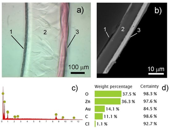 The microscopic examinations of thin cross-sections of the composites PMAA/AuNPs showed that the film had a complex asymmetric structure over the layer thickness. On the cross-section of the film, three layers are clearly visible: the near-electrode layer 1, the middle layer 2, and the layer 3 formed at the film/solution interface (surface layer) (Figure 11a). The thickness of the layers in the dry (b) and swollen (a) state is, respectively: 1–1.5/15–20 μm (1), 6–7/230–232 μm (2), 2–3/66–68 μm (3).