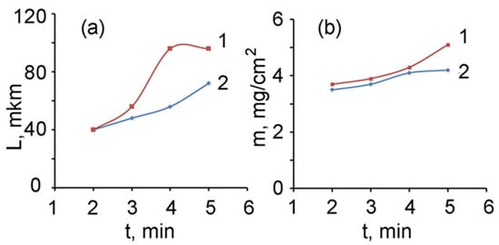 Thickness of layer 3 (a) and specific gravity of the PMAA/AuNPs composite (b) versus electrolysis time. 1–electrolyte 4, 2–electrolyte 3.