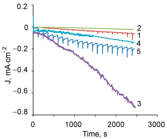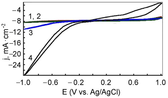 The addition of 0.08 mol/L of H2O2 to the phosphate buffer solution (PBS, pH 6.86) results in a noticeable jump in the potential in the range of H2O2 reduction (Figure 12). Here, the current density at the maximum point for the PMAA/AuNPs composite containing gold nanoparticles (Figure 13, curve 4) is 2.7 times higher than for the pure PMAA (Figure 13, curve 3). Consequently, the electrodes modified with the composite film PMAA/AuNPs exhibit selective behavior towards hydrogen peroxide.