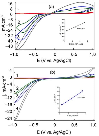 Cyclic voltammograms and dependence of the current density of the hydrogen peroxide reduction peak on its concentration for electrodes with PMAA/AuNPs (electrolyte 3) (a) and PMAA/AuNPs (electrolyte 4) (b) films in H2O2/PBS. H2O2 concentration (mol/L): 0 (1), 2.4 × 10−2 (2), 4.8 × 10−2 (3), 7.2 × 10−2 (4). Scan rate 100 mV/s.