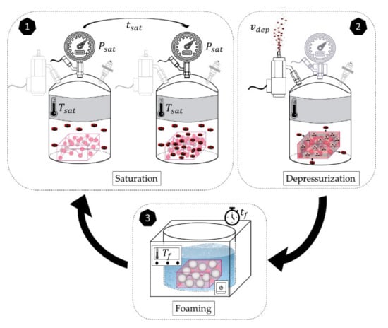 Gas dissolution foaming comprises three steps: saturation, depressurization, and foaming. During saturation, the polymer is introduced in a pressure vessel under certain gas pressure and temperature, parameters known as saturation pressure () and saturation temperature (). The gas, normally CO2, diffuses inside the polymer until the sample is fully saturated. The gas diffusion inside the polymer implies the reduction of the glass transition temperature () down to the effective glass transition temperature . After saturation time , the gas is fast released in the depressurization step at a specific depressurization velocity . This fast pressure drop results in a thermodynamic instability that creates nucleation points inside the polymer. Finally, in the foaming step, the polymer is introduced in a thermal bath at a foaming temperature higher than the effective glass transition temperature during the foaming time . At these conditions, the nucleation points evolve into cells.