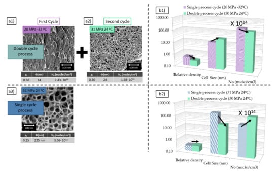 In comparison with the sample produced with similar conditions in just one cycle (31 MPa 24 °C), the introduction of a double cycle leads to a reduction of one order of magnitude in the cell size and an increase in two orders of magnitude in the cell nucleation density by almost keeping unchanged the relative density (Figure 2b2).