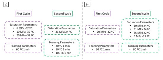 (a) Set of experiments to evaluate the effect of the first cycle saturation parameters and the effect of the second cycle foaming parameters on the final cellular structure. (b) Set of experiments carried out to evaluate the effect of the second cycle saturation parameters on the final cellular structure.