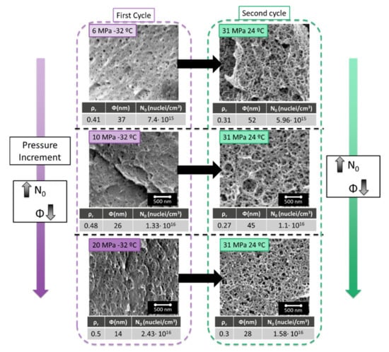 As shown in Figure 4, the cellular structures obtained after a second cycle performed at 31 MPa and 24 °C present a smaller cell size when the cell size of the starting cellular material obtained after the first cycle is also small. The results are similar for the cell nucleation density. The higher the cell nucleation density in the first cycle, the higher is the one obtained in the second one. The materials produced present interesting characteristics with a cell density over 1016 cells/cm3 and low relative densities.
