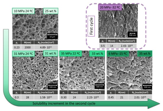 The influence of the production parameters has been studied. To minimize the cell size of the final material, it has been demonstrated that the cell size should also be minimum in the first cycle. A minimum cell size is reached through a maximum solubility; thus, 20 MPa and −32 °C were selected as the optimum saturation parameters in this work for the first cycle. The foaming parameters in the first cycle have been chosen to be 60 °C and 1 min to maximize the cell nucleation density.
