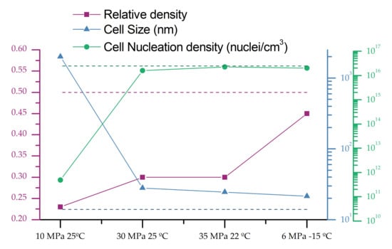 Those results can be deeply analyzed by measuring the relative density, cell size, and cell nucleation density (Figure 6). The dashed line in Figure 6 indicates the values for a material produced in a single cycle at 20 MPa −32 °C, with a cell size of 14 nm, a cell nucleation density of 2.43 × 1016 nuclei/cm3, and a relative density of 0.5. As previously commented, those cell size values are the smallest reported in the literature for PMMA, with a relative density of 0.5.