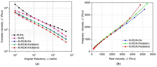 The rheological behavior of the R-PE/R-PA blends grafted by PE-g-MAH was evaluated using rotational rheometer in small-amplitude oscillation shearing mode. A MCR301 apparatus (Anton Paar GmbH, Graz, Austria) in plate–plate configuration with a 1 mm gap was used. The samples were dried overnight at 80 °C and tested in an angular frequency range of 1−500 s−1 under strain of 1%, which was in the linear viscoelastic (LVE) range, as proven by a preliminary amplitude sweep. An evaluation of zero shear viscosity (η0) was possible due to the rheological measurements in oscillatory mode and the calculations performed with Rheoplus 32 software V.3.40 (Anton Paar GmbH, Graz, Germany). A temperature of 230 °C was applied during the test to make sure that no polymer degradation would take place and violate the results.