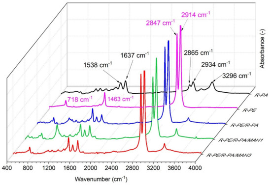 Fourier transform infrared (FT-IR) spectroscopy was used to identify peak shifts between the two polymers, to detect whether the type of interaction between the materials was strong or weak [46]. Figure 3 shows the FT-IR spectra of pure materials R-PE and R-PA, the R-PE/R-PA blend, and the R-PE/R-PA blend with the addition of PE-g-MAH compatibilizer.