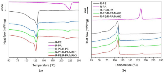 DSC (a) melting and (b) crystallization curves of R-PE, R-PA, R-PE/R-PA binary blend, and R-PE/R-PA blends grafted by PE-g-MAH.