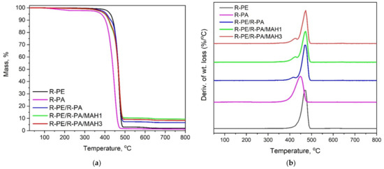 From Figure 5a we can see that the decomposition temperature (T5%) increases when PE-g-MAH is added to the PE/PA blend. When 3 wt.% of PE-g-MAH is added, the decomposition temperature (as measured at the point of 5% mass loss) increases from 401 to about 408 °C. This means that the R-PE/R-PA/MAH blend has the highest thermal stability compared with polyethylene and polyamide. This may be due to the good dispersion of the polyamide in the polyethylene matrix with the participation of the compatibilizer. According to Zhai, the reason for this may be that the thermal properties of PE-g-MAH are much better than those of polyethylene [55]. The result is consistent with what was found by Yousi et al. [54] in case of talc-filled PP/PA nanocomposites. The authors noted that the addition of talc fillers induced a significant decrease in the size of the PA6 domains, which is related to the higher thermal stability of the PP/PA blends [54]. A similar effect was observed by Araújo et al. in a mixture of polyamide with high-density polyethylene and the compatibilizer [56].