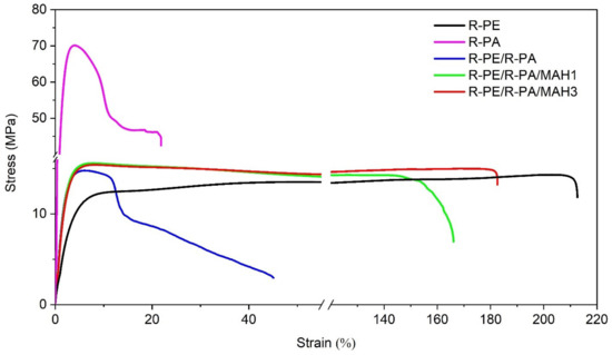 Stress–strain curves of R-PE, R-PA, and R-PE/R-PA blend with varying compatibilizer content.