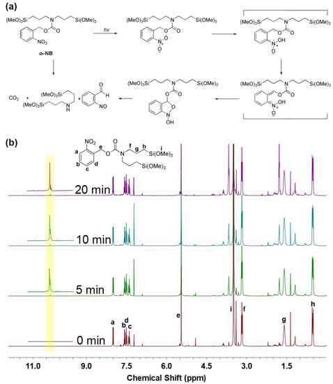 (a) The photolysis mechanism of o–NB upon irradiation at 254 nm. (b) Comparison of the 1H NMR spectra of o–NB after irradiation 0, 5, 10, and 20 min, depicting its photoresponsive behavior with the disappearance of the benzyl peak at 5.4 ppm (Ph–CH2–).