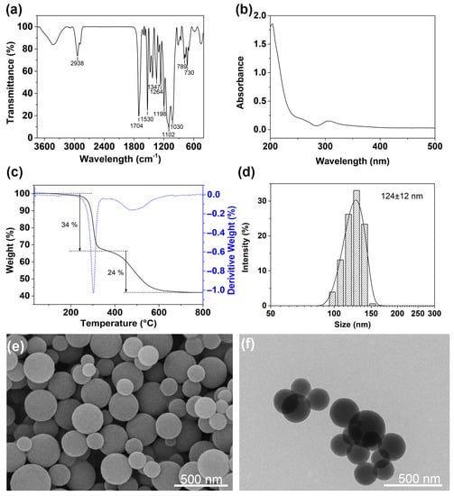 FTIR (a), UV–vis (b), TGA (c), and DLS (d) spectra of BPS. SEM (e) and TEM (f) micrographs of BPS.
