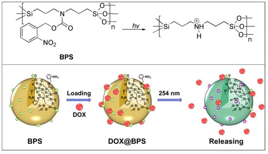 The following are available online at https://www.mdpi.com/article/10.3390/polym13152392/s1, Figure S1: 1H NMR spectrum of o-nitrobenzyl chloroformate, Figure S2: 13C NMR spectrum of o-nitrobenzyl chloroformate, Figure S3: 1H NMR spectrum of o-nitrobenzyl bis-trimethoxysilylpropyl carbamate, Figure S4: 13C NMR spectrum of o-nitrobenzyl bis-trimethoxysilylpropyl carbamate, Figure S5: 29Si NMR spectrum of o-nitrobenzyl bis-trimethoxysilylpropyl carbamate, Figure S6: MS spectrum of o-nitrobenzyl bis-trimethoxysilylpropyl carbamate, Figure S7: The calculated chemical structures of o–NB monomer (a) and photolysis by-product o-nitrosobenzaldehyde (b), Figure S8: DOX release profiles of DOX@BPS from 0 to 16 h at different laser intensities (0, 60,160, and 200 mW/cm2) in PBS buffer solution (pH 7.4) at 37 °C.