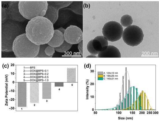 SEM (a) and TEM (b) micrographs of DOX@BPS; (c) zeta potential of DOX@BPS prepared with different feed ratios; (d) size of BPS (A), DOX@BPS (B) and DOX@BPS after drug release in PBS buffer solution (pH 7.4) upon light irradiation (C).