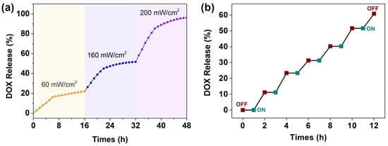 (a) DOX release profiles of DOX@BPS at different laser intensities in PBS buffer solution (pH 7.4) at 37 °C. (b) Progress of release of DOX under light irradiation and dark conditions; “ON” indicates the beginning of light irradiation and “OFF” indicates the ending of light irradiation.