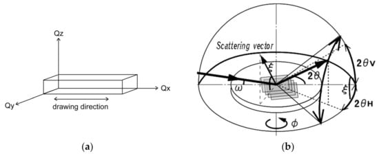 The grazing-incidence X-ray diffraction (GIXD) measurements were performed at a BL13XU beamline of SPring-8 (Japan Synchrotron Radiation Research Institute (JASRI), Hyogo, Japan) equipped with ATX-GSOR (RIGAKU Co., Tokyo, Japan). The wavelength, λ, of the monochromatized incident X-ray was 0.099 nm. The beam size at incident slits was 0.1 mm × 0.1 mm square. The GIXD patterns are represented in reciprocal space with scattering vector (Q = 4πsinθ/λ, where θ and λ are the Bragg angle and the wavelength of the incident X-ray, respectively) Qx, Qy and Qz; the scattering vector Qx is parallel to the film surface and parallel to the drawing direction as shown in Figure 1a; Qy is parallel to the film surface and orthogonal to the drawing direction; Qz is normal to the film surface. The grazing angle of incident X-ray, ω, is fixed at 0.14° to ensure total reflection against the substrate (Qxy). The angle, φ, between the scattering vector and the drawing direction of friction transfer was fixed during the in-plane θ–2θ scan; θ = 0° for the GIXD patterns with Qx and 90° for that with Qy. For the in-plane θ–2θ scan, the scanning speed was 2°/min and the interval step was 0.02°. The molecular orientation distribution is determined by the locking scan, which is performed at a fixed Q at the scanning speed of 10°/min with the interval step of 0.4°. Silicon was used as a substrate for GIXD measurements.
