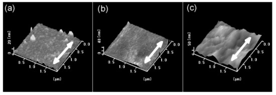 AFM images of the friction-transferred films on the glass substrates; (a) PT; (b) P3HT; (c) P3DDT. The drawing direction of transfer is indicated by the arrow.