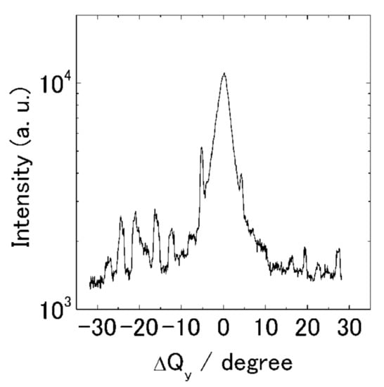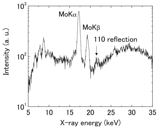 In order to confirm the orientation concerning the substrate plane, we performed the ED-GIXD measurements of a diffraction with changing angles between its scattering vector and the substrate plane [40]. In these measurements, the diffractions were measured not only in the ‘in-plane’ direction (Qx, Qy) and ‘out-of-plane’ direction (Qz), but some intermediate directions. In ED-GIXD, because the measurements can be performed with the fixed optics of X-rays, the orientation distribution of the crystallites concerning the substrate can be evaluated quantitatively. In this measurement system, as we used the white X-ray from a tube as the source, the scattering intensities are very weak and only the (110) reflection, which is the strongest, could be observed. Figure 7 shows a typical energy-dispersive diffraction spectrum. The scattering angle was fixed at 2θ = 7°. The (110) was observed at around E = 22 keV corresponding to d = 0.23 nm.