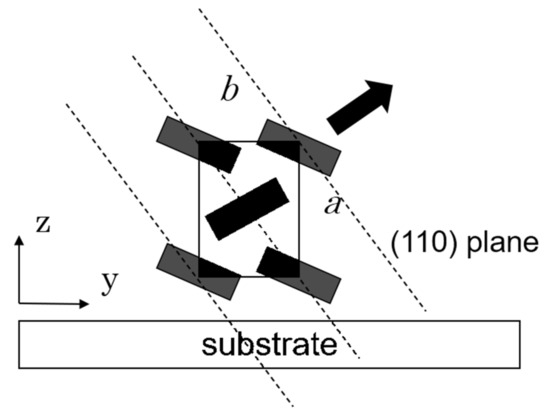 The profiles along the Qy and Qz directions are not similar to each other. This suggests that the PT crystallites should not assume simple uniaxial orientation. The orientation of crystallites contains some different orientations, but there is a preferential orientation with respect to the substrates. Here, we compare GIXD results with the X-ray diffraction profiles of powder samples [54]. In powder patterns, the (110) reflection is strongest and (200) and (210) follow it, but the (020) reflection is weak. GIXD along the Qz direction (110) seems to be weak and (200) reflection appears relatively strong. Along the Qy direction, (210) and (020) are observed to be relatively strong. These results suggest that the a and b axes have some orientation concerning the substrate plane. We have observed preferential orientations concerning the substrate in the friction-transferred films of P3ATs [40,41]. Now, we suppose PT molecules take a preferential arrangement in which the a-axis is normal to the substrate, the b-axis is in the substrate plane, and the molecular chains (c-axis) are in the substrate plane and aligned along the friction transfer direction, as shown in Figure 7, because of the following reasons. (1) The intensity of the (200) peak in the GIXD pattern (Qy) is remarkably weak compared to (110) peak and (2) whereas the (020) peak is not observed in ordinary X-ray profiles due to a weak intensity, this peak appears in the Qy pattern.