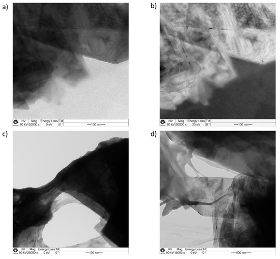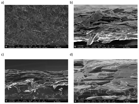 The presence of cellulose and its adhesion to the graphite/graphene lamellae is shown more clearly in Figure 2c,d, where thin cellulose films are bound to graphite lamellae sides and surfaces, forming large holes as well as “necks”. These morphologies are expected for a plasticized non-crystalline polymer drying while adhering to a stiffer material. In the present case, the polymer is cellulose, bound to graphite/graphene.